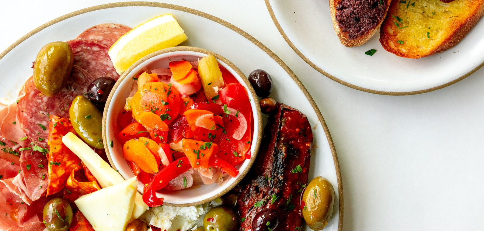 Marinated eggplant, olivata, pomodori al forno, salumi, cheeses
