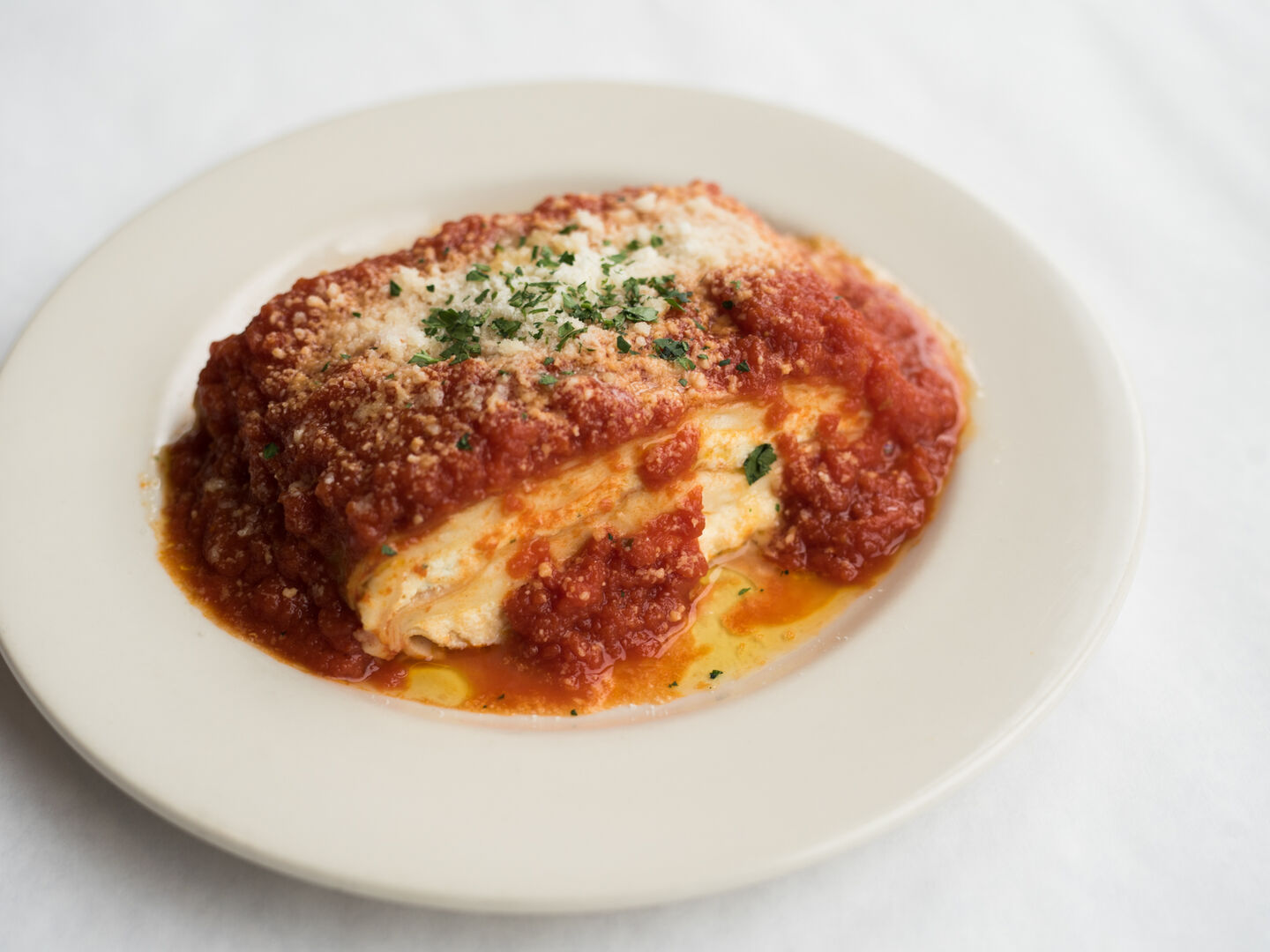 9. Using a wide offset spatula or even a pie server, place each portion on a plate. Ladle the hot marinara over each piece and garnish with the included Parmiggiano-Reggiano. Enjoy!